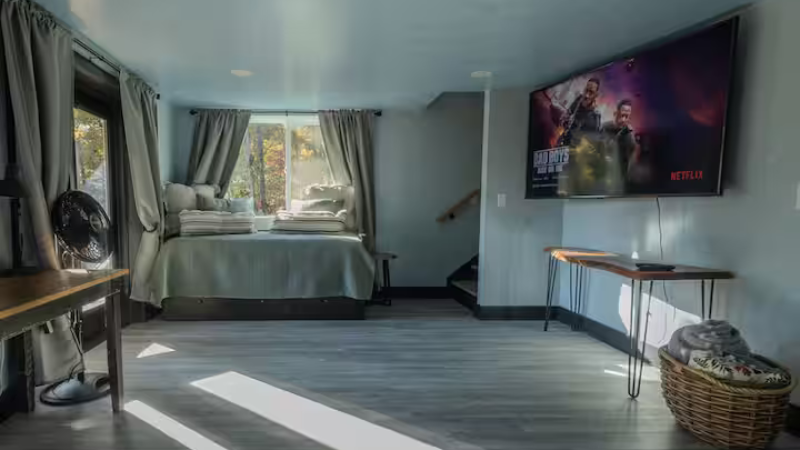 The basement features an 85 inch TV with Google SmartCast technology. The fitness center room has an elliptical, pull up/power dip station, 150 lbs of dumbbells, medicine balls, and a bench. Need to wash some laundry, help yourself to side by side washer and dryer, complimentary detergent, fabric softener, and dryer sheets. Basement will possibly sleep three to four people. Cause them sofas are monster big and comfortable. Custom built wood work station with Lamp and power strip. The day bed converts into queen bed (just pull the base out move mattress down.